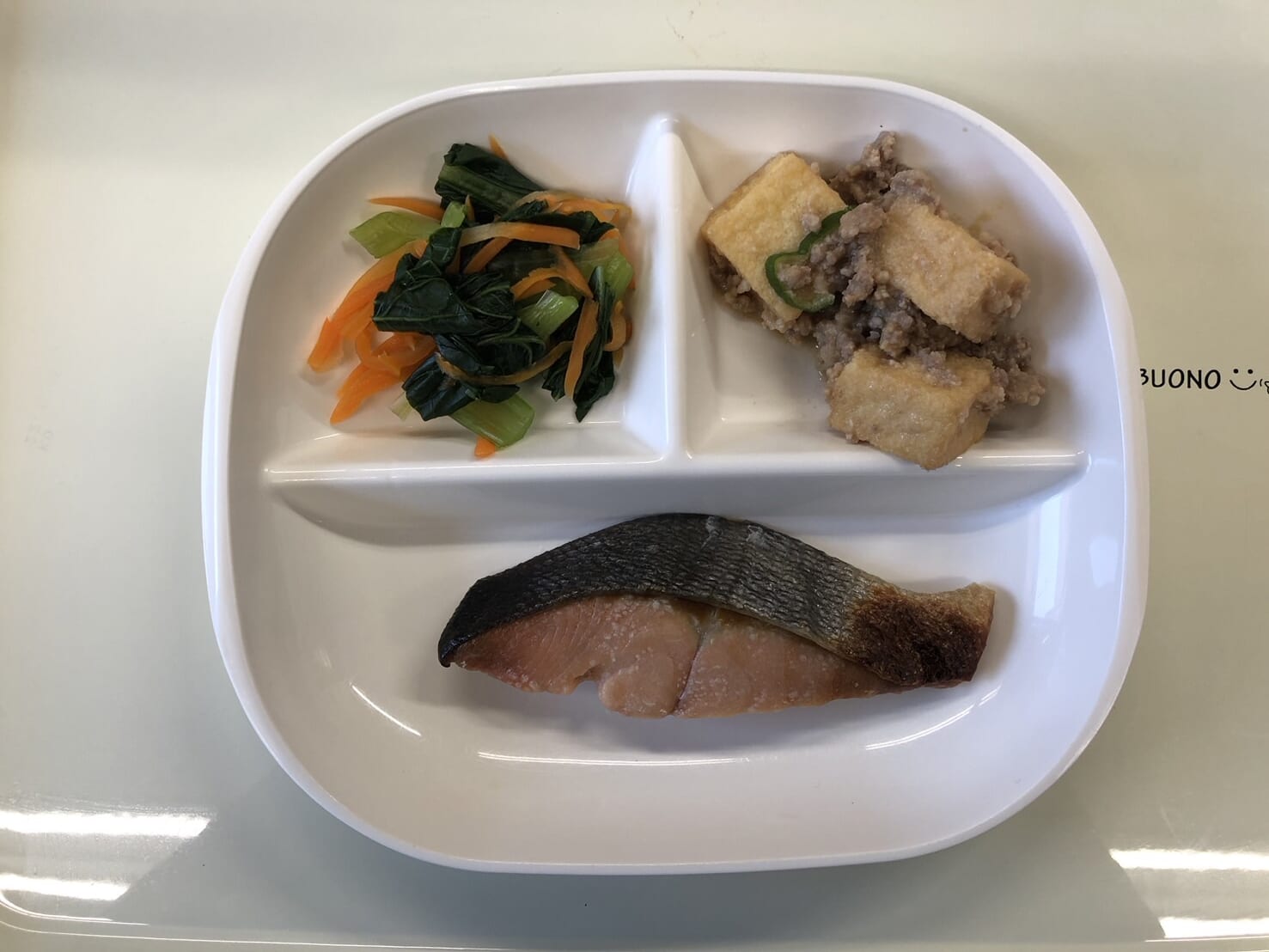 ・焼き魚 ・厚あげの肉みそ炒め ・小松菜おひたし ・ご飯 ・味噌汁