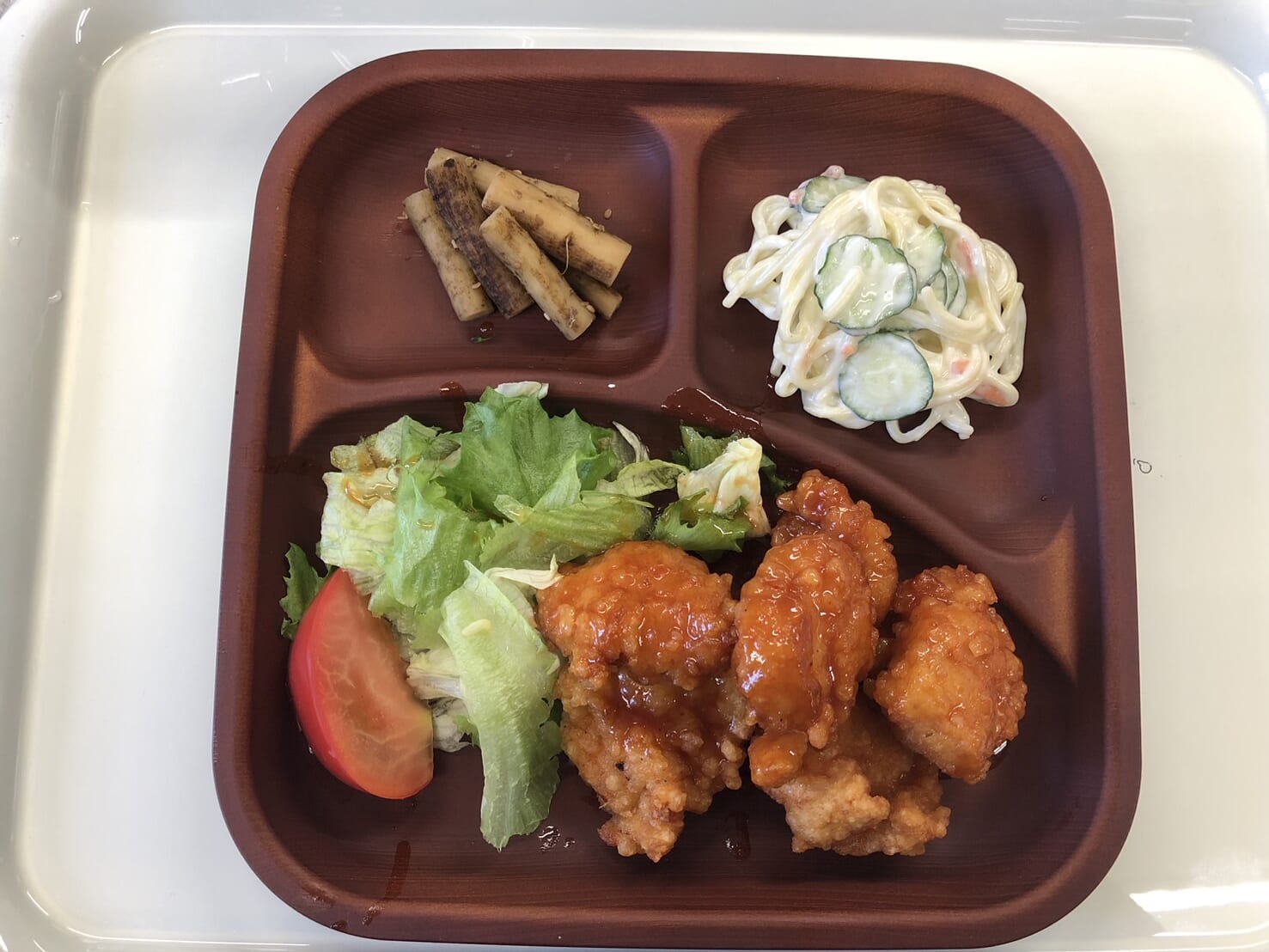 ・ヤンニョムチキン ・スパゲティサラダ ・たたきごぼう ・ご飯 ・味噌汁