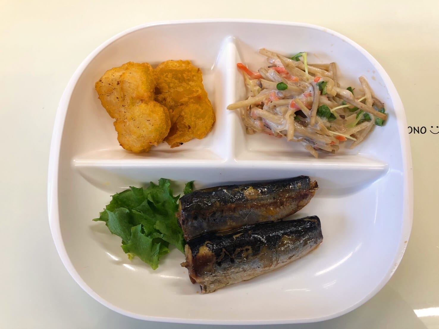 ・いわしのしょうが煮 ・ごぼうサラダ ・チキンナゲット ・ご飯 ・味噌汁