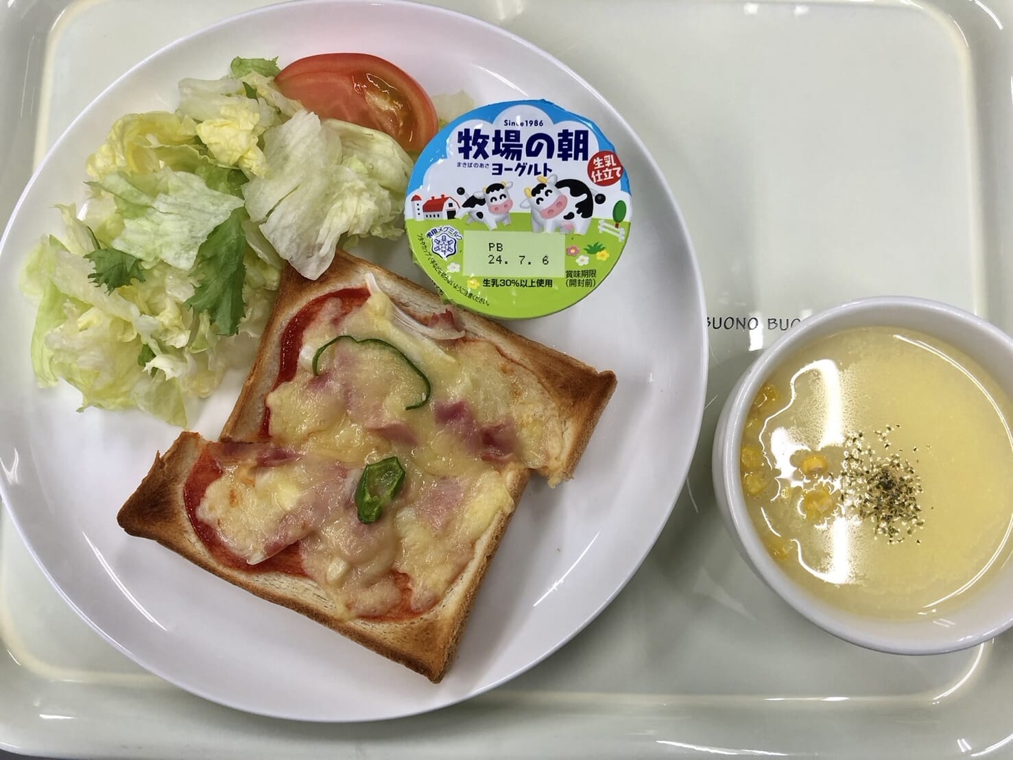 ・ピザトースト ・コーンスープ ・グリーンサラダ ・ヨーグルト