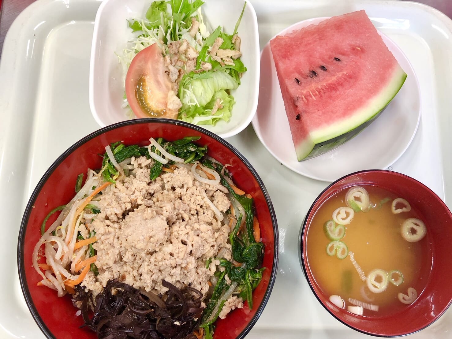・ビビンバ丼 ・グリーンサラダ ・味噌汁 ・スイカ