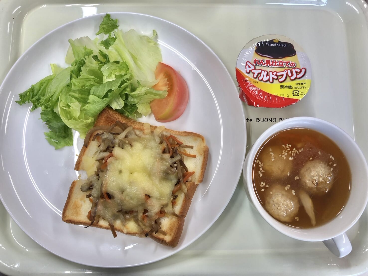・きんぴらごぼうトースト ・サラダ ・スープ ・プリン