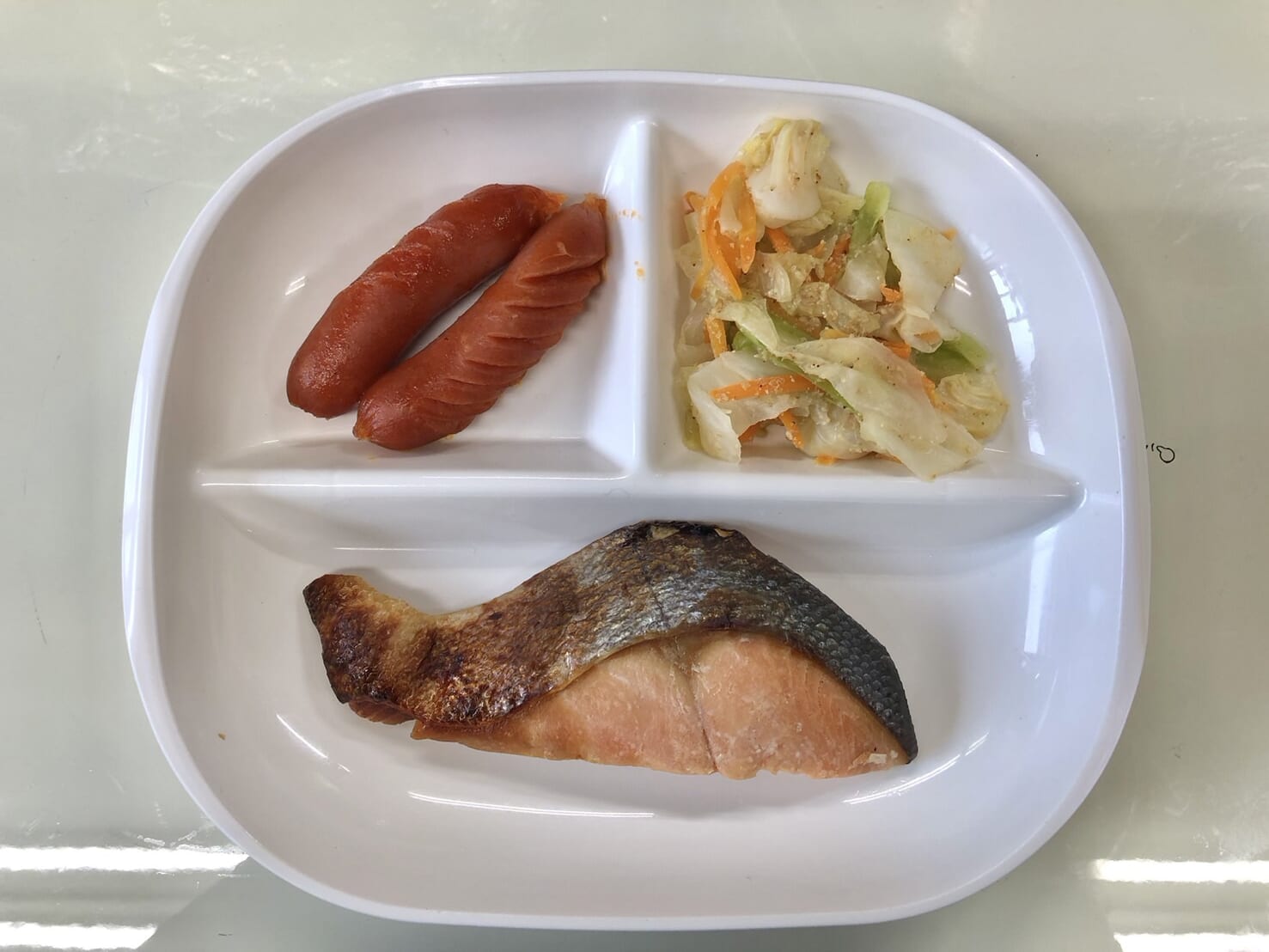 ・焼き魚 ・ウインナーケチャップ ・キャベツのごま和え ・ご飯 ・味噌汁