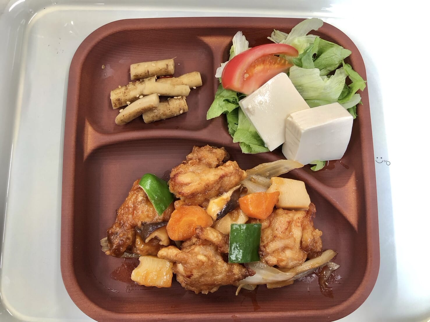 ・酢豚 ・豆腐サラダ ・たたきごぼう ・ご飯 ・味噌汁