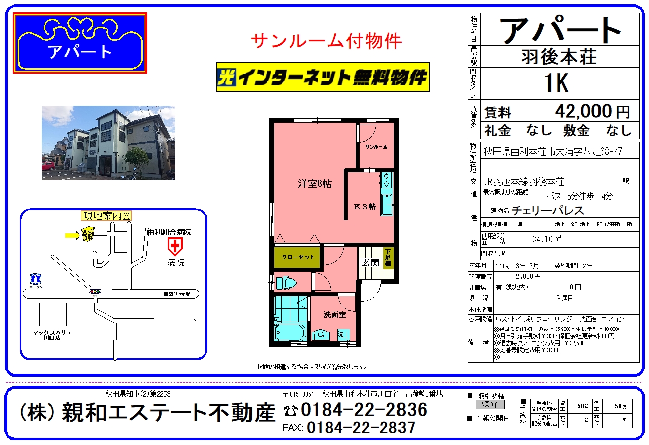 - 1K/ 洋室8帖・キッチン3帖・洗面所・サンルーム・ユニットバス・トイレ・クローゼット